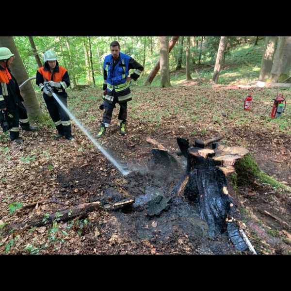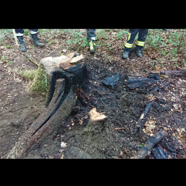 Wir löschten das Feuer und kühlten die Glutnester im Waldboden um den Baumstumpf herum mit Wasser ab.