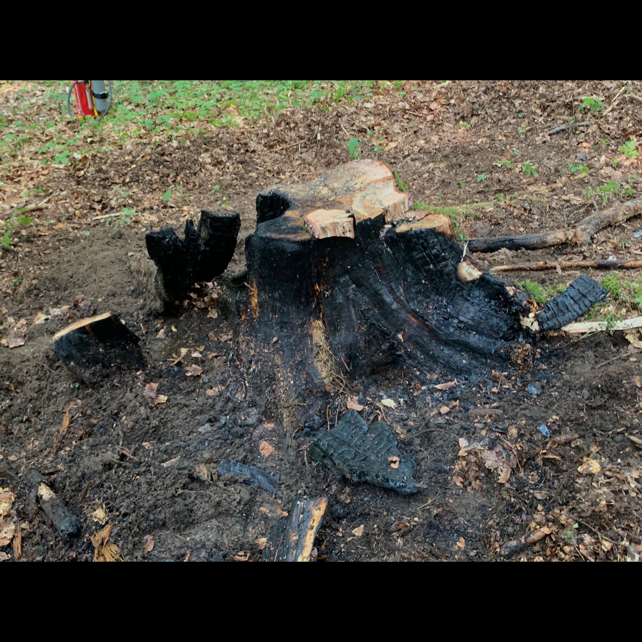Nach kurzer Inspektion der Polizei, spritzten wir den Baumstumpf und den Boden um diesen nochmal nass, dass keine neuen Glutnester entstehen konnten.