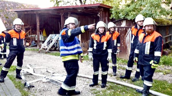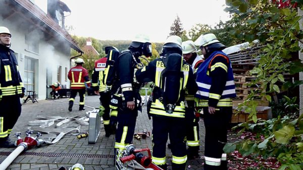 Unsere vier Atemschützer machten sich direkt nach der Ankunft in Entenberg bereit und rüsteten sich mit je einem Pressluftatmer, einer Feuerwehrleine und einer Taschenlampe aus. Zwei unserer Atemschützer meldeten sich bei der Atemschutzüberwachung und gingen in das „brennende“ Haus. Die anderen beiden warteten davor als Sicherungstrupp und wurde nach der Rückkehr des Angriffstrupps in das Haus geschickt.