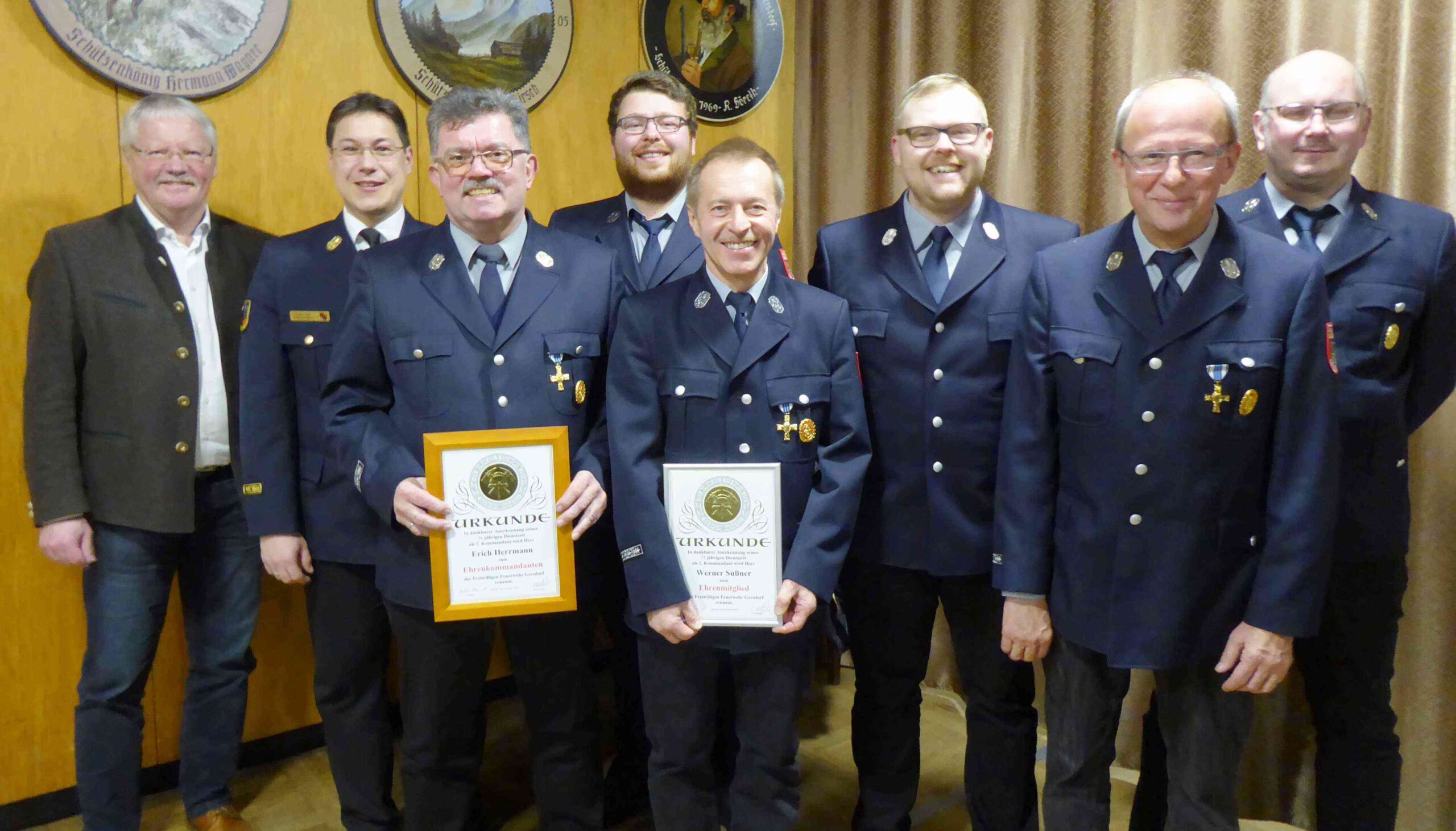 Bei den Ehrungen wurden Martin Dusold, Frank Reiß, Gerd Liebel und Andreas Oppel für 20 Jahre sowie Jochen Bohrer, Klaus Schreimel und Siegfried Schmidt für 30 Jahre aktiven Dienst von Kommandant Herrmann mit einer Urkunde gewürdigt .Vorstand Schreimel ehrte Michael Horndasch für 25 Jahre Vereinszugehörigkeit. Walter Buchner hält seit 50 Jahren den Verein die Treue und Willi Büttner, Hans Lehr, Karl Scharrer und Konrad Schreimel sind seit 60 Jahren unerschütterliche Vereinsmitglieder die mit einer Ehrenurkunde ausgezeichnet wurden.